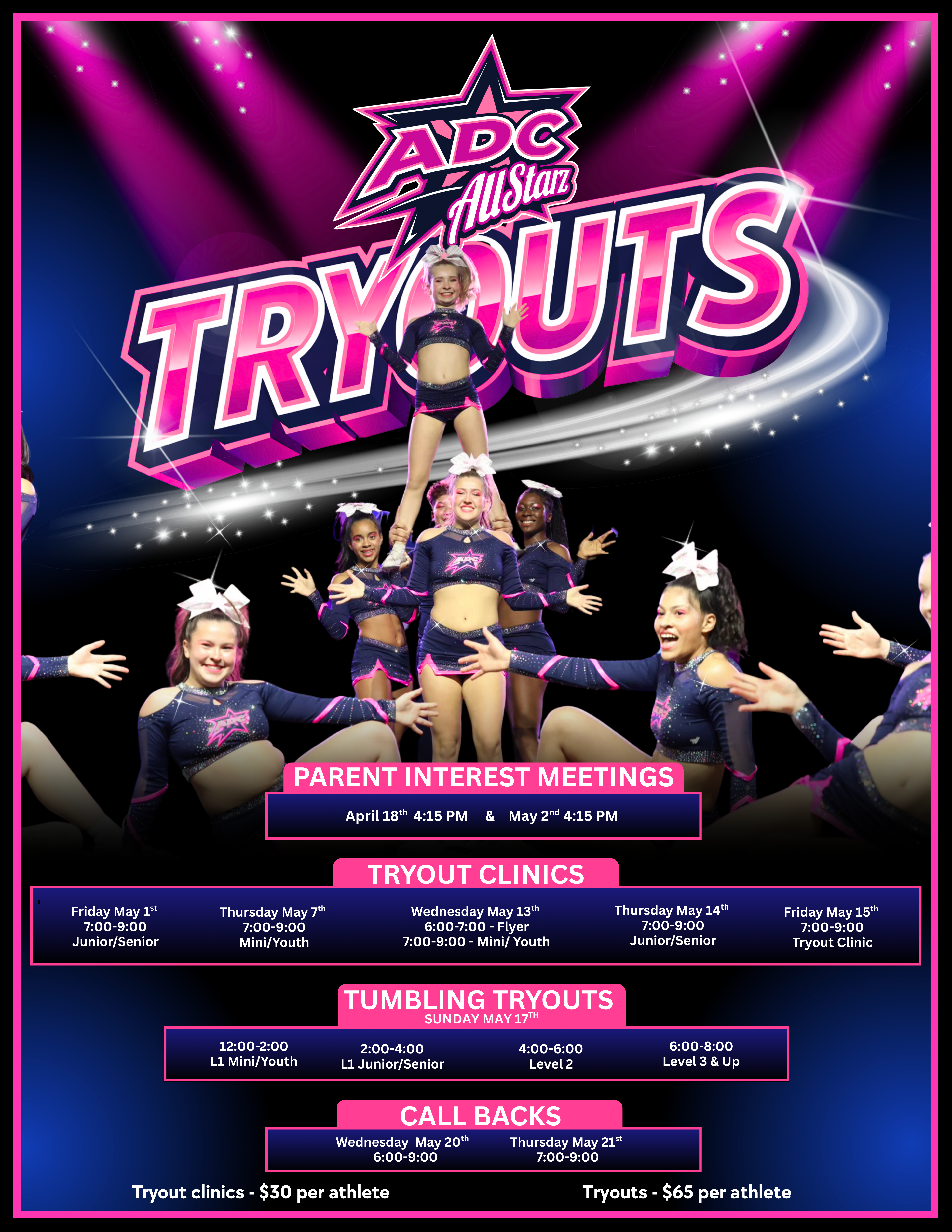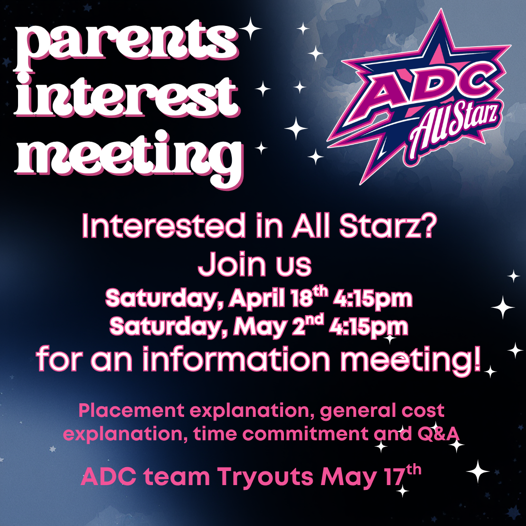 Welcome to our ADC AllStarz Galaxy! ADC stands for Athletic, Dynamic, and Confident. Our mission is to produce strong, confident athletes who can go out into the world to become strong, confident humans. We emphasize the importance of appropriate training and safety in our sport of all-star cheer, including conditioning, technique, and perfection before progression skill training. Just as importantly, we also focus on promoting sportsmanship, respect for your peers, and having fun. Our goal is to make each team competitive, but more importantly, we want our ADC All Starz all-star cheer athletes to learn valuable lifelong lessons in friendship, teamwork, time management, and community service. We would like to extend a warm welcome to all new athletes joining our program. We promise that being a part of ADC AllStarz Galaxy will be a life-changing experience! We would also like to express our gratitude to all our returning members who continue to be a part of our growing Galaxy !